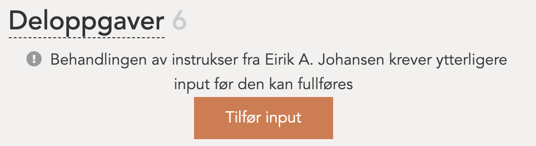 Ved å trykke på "Tilfør input" får du anledning til å supplere informasjonen som mangler for å fullføre instruksene. Det er kun den som la inn de originale instruksene som har tillatelse til å tilføre input til disse.