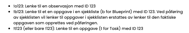 For å lenke mellom innhold i Wecomplish, bruk formatet !X123 hvor X representerer forbokstaven til typen innhold det lenkes til, og 123 representerer ID-en. Finn ID-nummeret som de siste sifferne av URL´en.