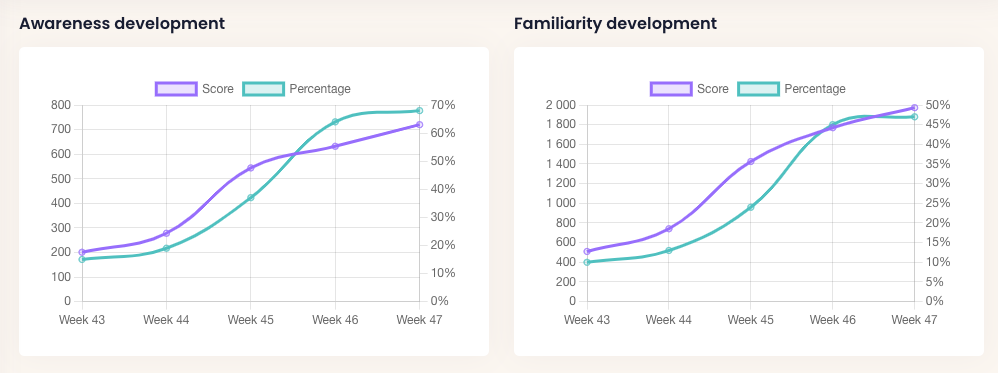 There are two charts indicating changes in awareness and familiarity respectively. They are displayed at the top of the role list of a person, and at the bottom of the single role view of a person.