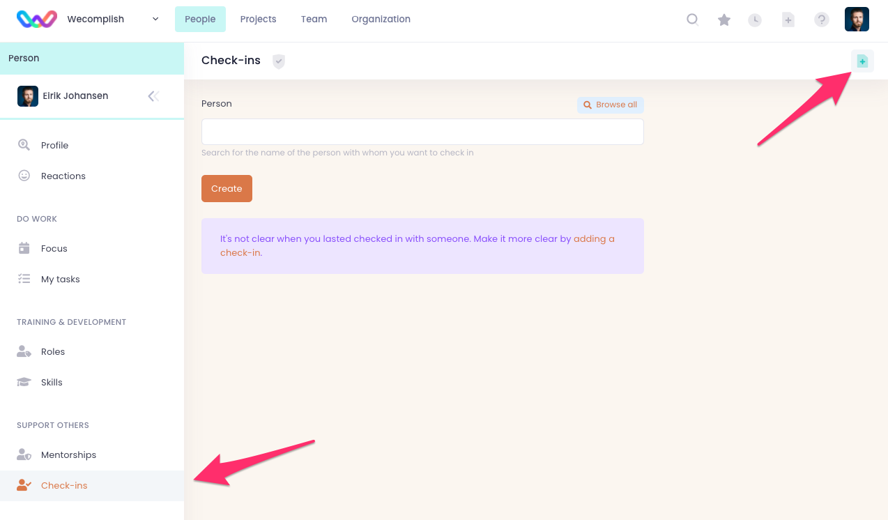In order to log a check-in with someone, go to the Focus-dashboard of that person and click the "New check-in button.