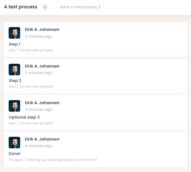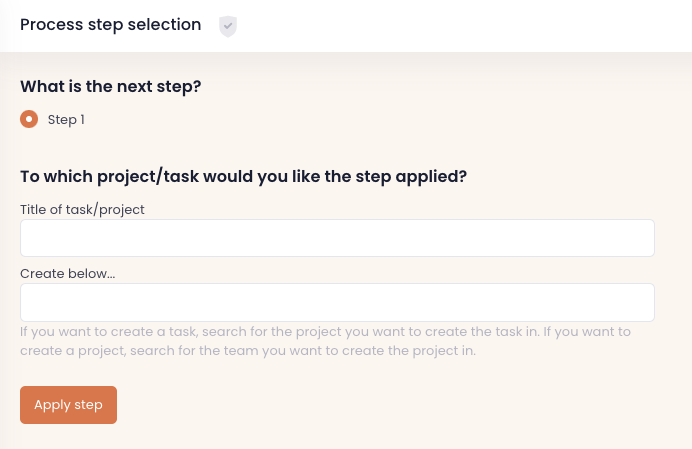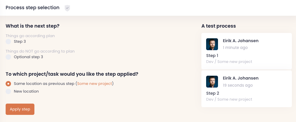 When completing a task created from a process step, and provided that there are remaining steps in the process, you will be automatically brought back to the step selector where you can choose the next step from the steps available.