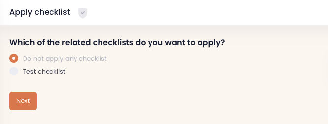 If the step you choose to apply has checklists associated with it, you will be sent to the checklist applier. Here you decide which checklist (if any) you want to apply to the task representing the process step.