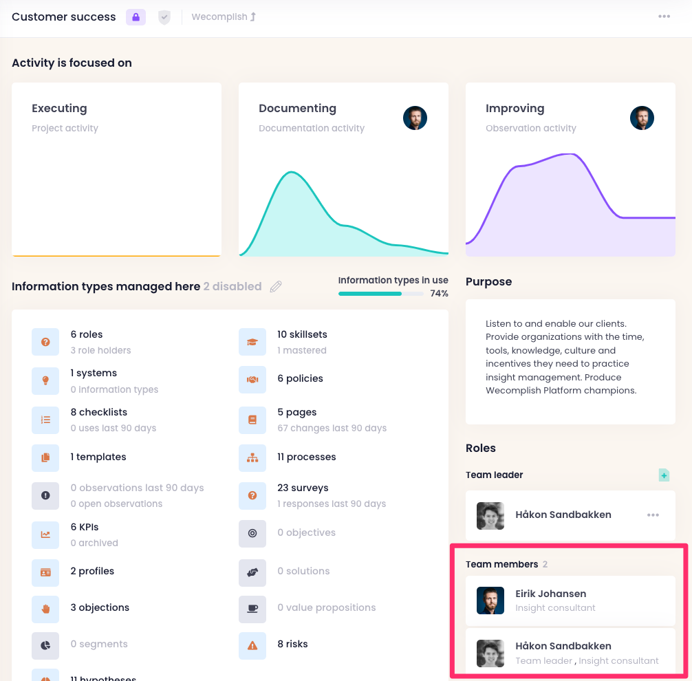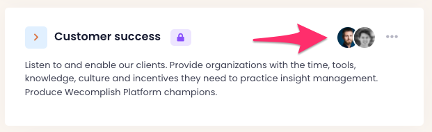 The people who have a role in the team are displayed in the upper right corner of the team card, and as a list on the team dashboard.