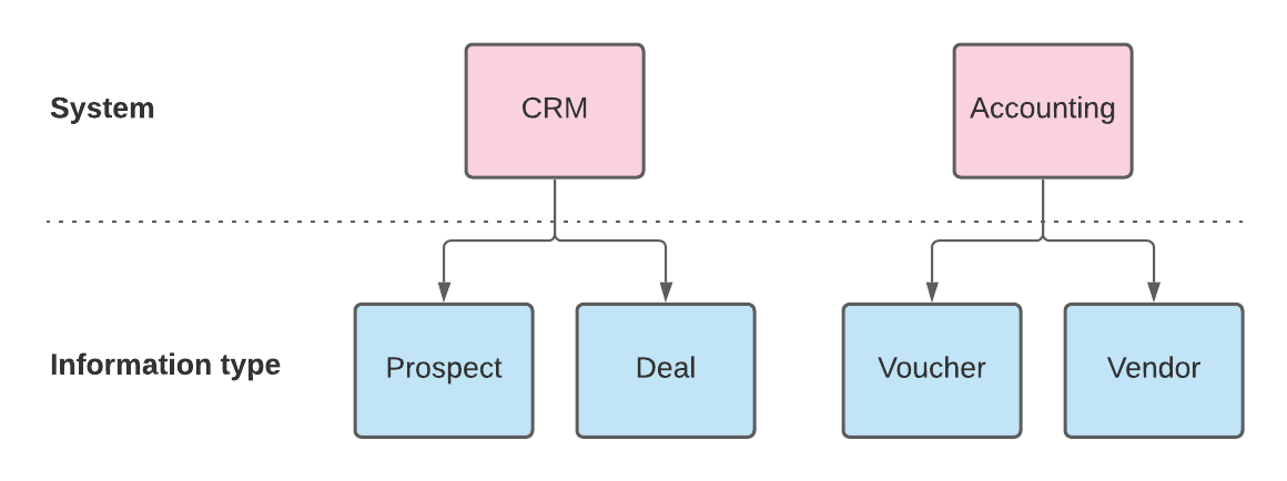 Within these systems, the information types relevant for their respective domains are managed. Within CRM the information types might be prospects and deals, whereas in accounting it's vouchers and vendors.