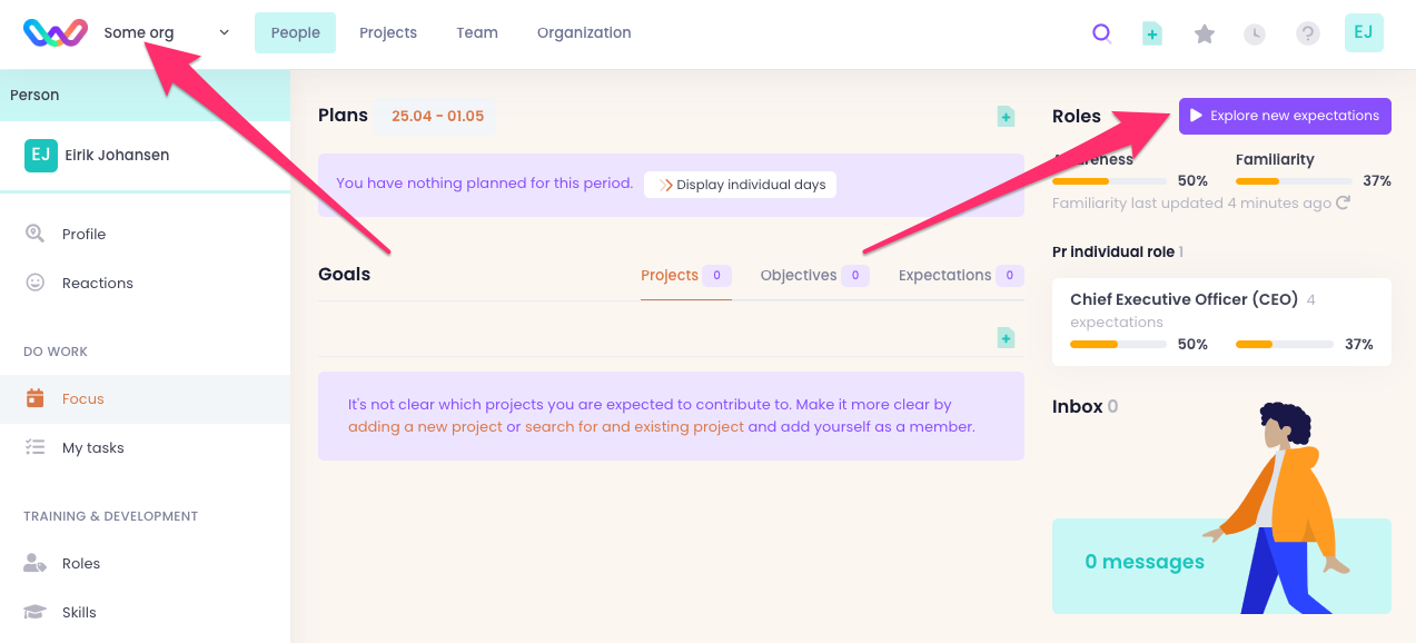 If you want to indicate your familiarity with an individual role expectation, navigate to the role in question, select the expectation type in the right column, and then click the particular expectation in the left colum.