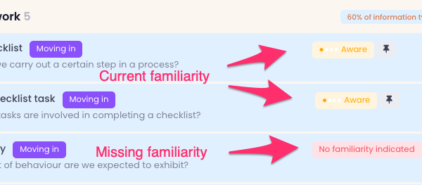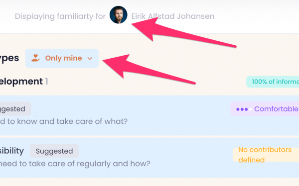 The insight type a person is expected to contribute are those with a light blue background, and where you, on the right hand side, can see either an indication of current familiarity, or an indicator showing that familiarity is missing.