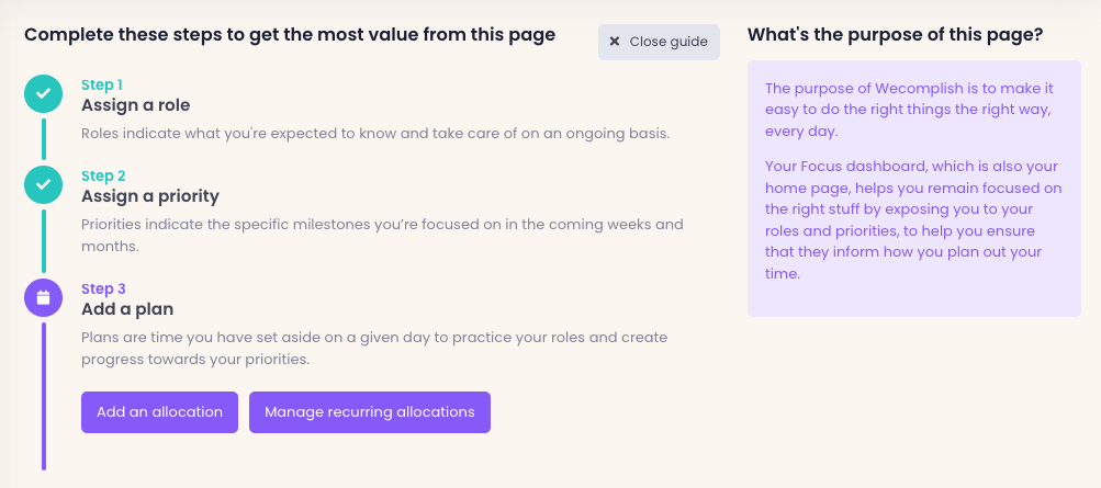 The intention of these guides is to help you get started by explaining the purpose of the page and the recommended steps to complete in order to gain the intended value from it.