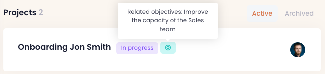 In order to make it more clear which projects are designed to impact an objective and which aren't, an objective indicator is shown in the project item view. If the indicator is green, the project is associated with one or more objectives. Hover over the indicator to see which objectives the project is designed to impact.
