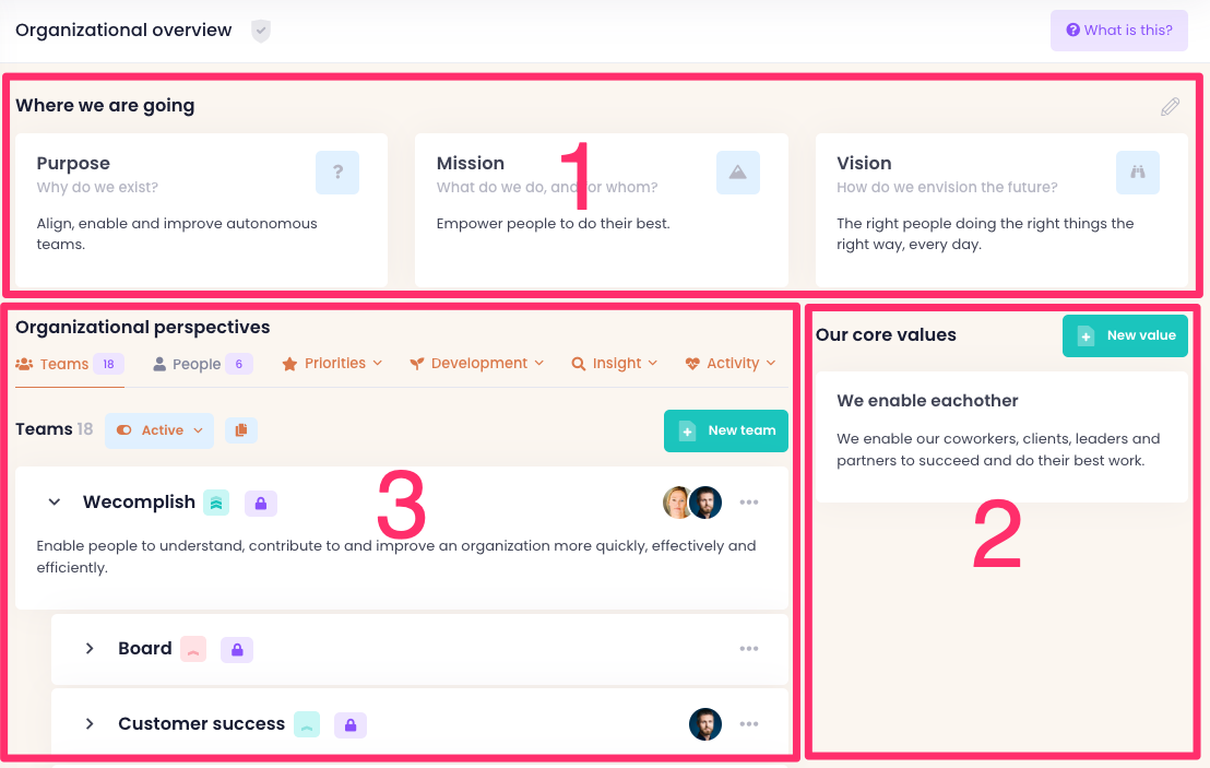 The organizational overview provides transparency into how an organization operates by starting with a birds-eye overview of the organization.