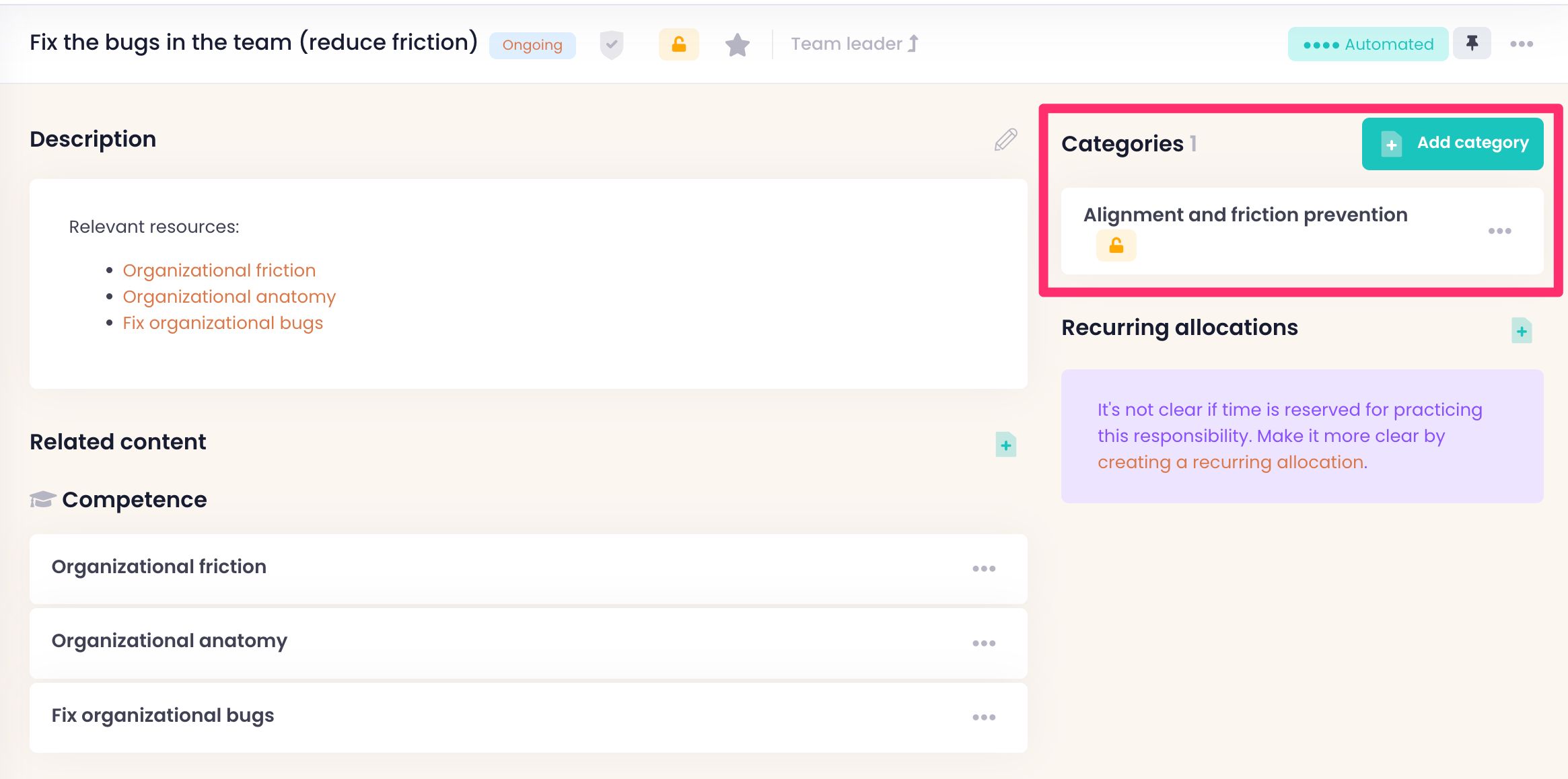 To preserve role clarity of a growing role you can categorize the responsibilities that naturally fit togheter. Categorizing a responsibility is done by clicking the name of the responsibility and managing the categories in the right column.
