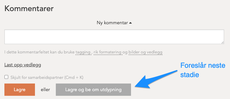 Observasjonens status kan også endres som en del av det å legge til en kommentar ved å trykke på den alternative Lagre-knappen. Denne knappen foreslår neste status basert på nåværende status: